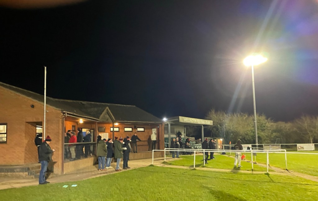 Another sizable contingent of Spa fans braved sat-nav directions. I’m sure our party used roads last crossed by Dick Turpin and Black Bess. Eventually, they made it through the wilds of the Worcs-Hereford border lands. They reached the pleasant village of Wellington. They were greeted by friendly faces of Wellington FC officials. These faces bore the words few weary travelers want to hear. “There’s no bar!!” Undeterred, the Spa faithful enjoyed hot teas and coffees served in proper mugs, which you don’t see everywhere.